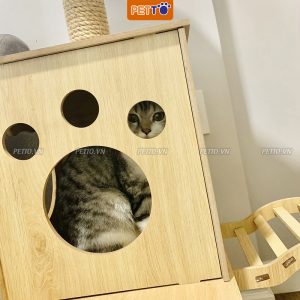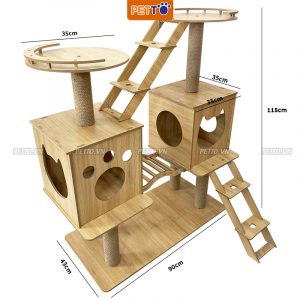 Sản phẩm nhà cây cho mèo được thiết kế với 2 trụ cào móng được dây quấn bao quanh bởi lớp thảm poly là nơi phù hợp cho sở thích cào móng của mèo. Và kết nối với 2 nhà hình hộp cho mèo nằm có thể đi lại qua nhau. Trên đỉnh còn có 1 chỗ đứng mèo có thể đi lên bằng cầu thang.
