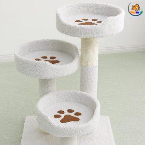 Được thiết kế bao gồm 3 trụ cào móng và trên đỉnh 3 trụ cào đều có ổ đệm được nối tiếp nhau bằng tấm đế gỗ. Trụ cào móng an toàn không gây xước và tổn thương. Tạo sự hấp dẫn cho mèo cưng chơi đùa, lèo chèo thỏa thích, mệt có thể nghỉ ngơi. Mèo có thể ngủ 14 tiếng một ngày trong cat tree.