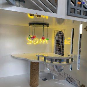 – Nhà cho mèo bằng gỗ có thiết kế điệu đà với phần mái nhọn và hệ thống đèn led neon sang trọng